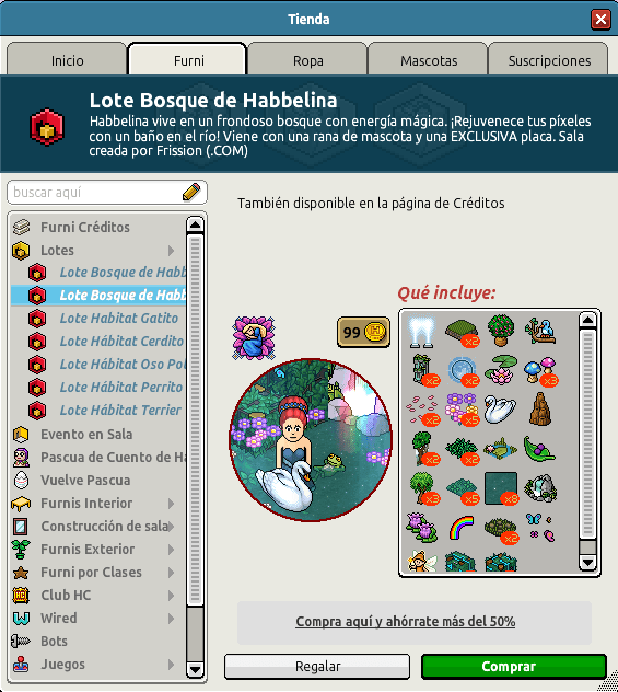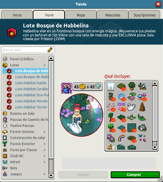 Te hablamos del Lote Bosque de Habbelina. Como sabrás, Habbelina vive en un frondoso bosque con mágica energía. ¡Rejuvenece tus píxeles bañándote en el río! Además, conseguirás una rana de mascota. No olvides que estará disponible por tiempo limitado y por un precio de 45