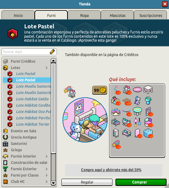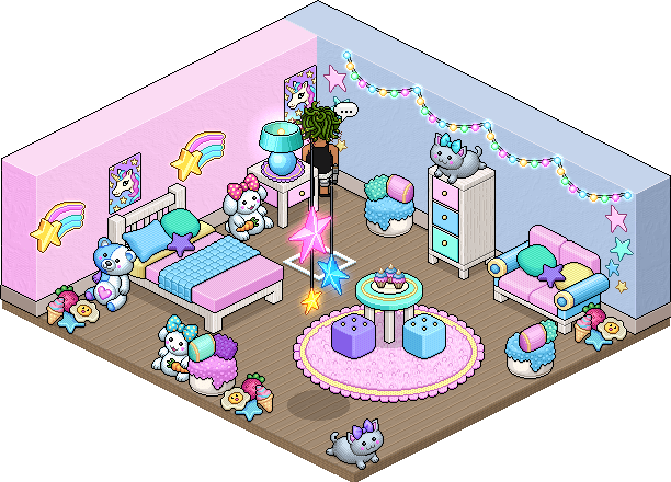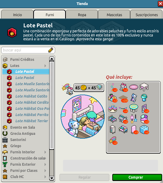 Este lote llamado Lote Pastel y es una combinación esponjosa y perfecta de adorables peluches y furnis estilo arcoíris pastel. Cada uno de los furnis contenidos en este lote es 100% exclusivo y nunca estará a la venta en el Catálogo. ¡Aprovecha esta ganga! Como podrás observar en las imágenes, puedes hacerte con un lote por un precio de 45