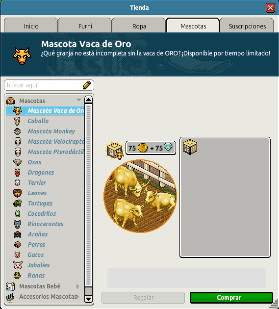 En esta ocasión podrás conseguir una Mascota Vaca de Oro, ¡con placa incluida! ¡No te la pierdas! Hoy podrás adquirir una única especie, al precio de 75