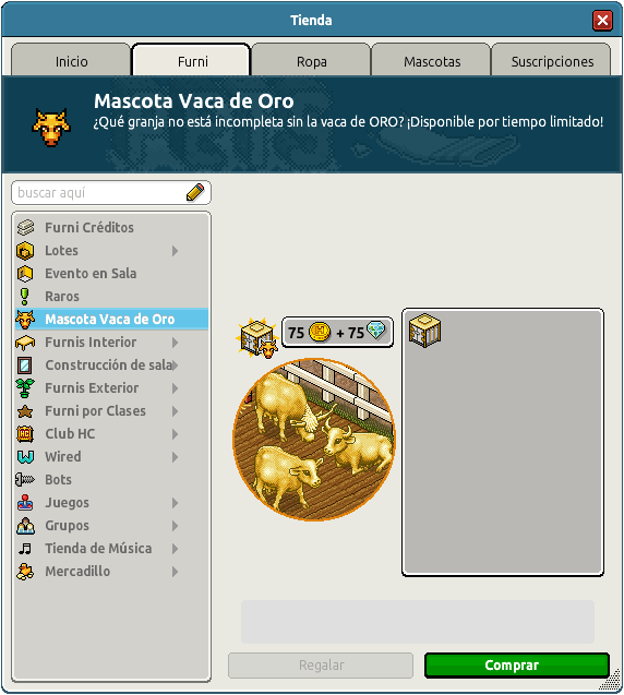 En esta ocasión podrás conseguir una Mascota Vaca de Oro, ¡con placa incluida! ¡No te la pierdas! Hoy podrás adquirir una única especie, al precio de 75