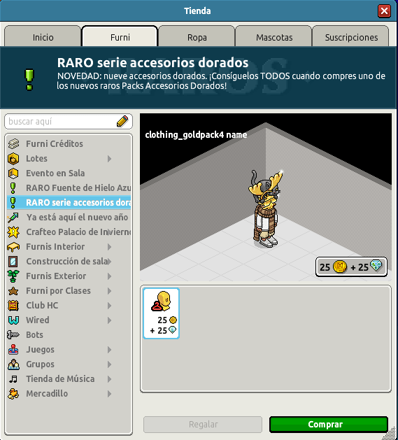 Os hemos anunciado varias semanas atrás que estaba por llegar un nuevo Pack de oro que incluía diferentes accesorios dorados. Ha sido un furni esperado por muchos usuarios ya que ¿quién no quiere poner un poco de oro en su look? Recordemos que este pack incluye accesorios dorados distintos a los lanzados en versiones anteriores.