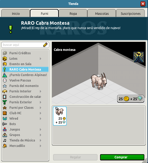 El raro de hoy recibe el nombre de RARO Cabra Montesa. Si es de tu agrado y crees que puedes hacerle hueco en alguna de tus salas al rey de la montaña, podrás hacerte con él por un precio de 25