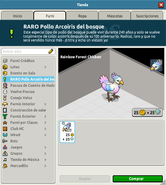 Estamos hablando del RARO Pollo Arcoiris del Bosque, este particular tipo de pollo del bosque puede vivir 240 años y solo se vuelve totalmente arcoiris después de cumplir 100 años. ¡Radical, raro que nunca será vendido de nuevo, échale un vistazo ya! Puedes hacerte con una unidad por tan solo 25