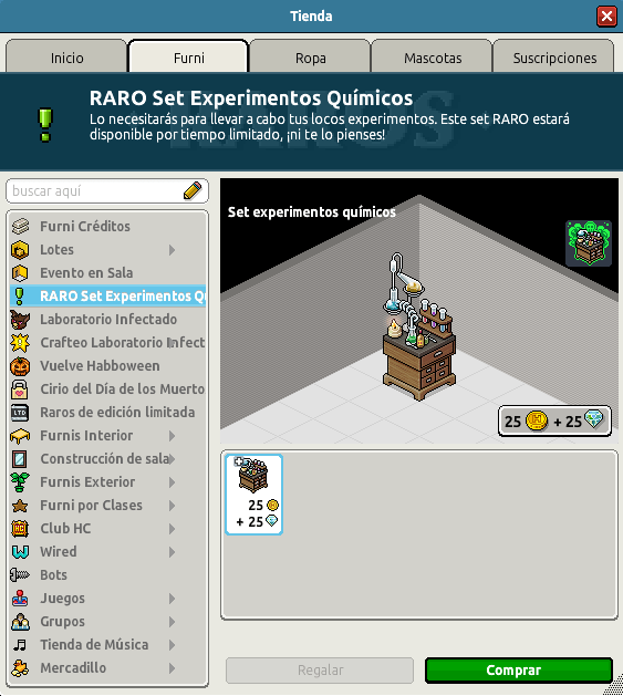 La campaña de Habboween está en pleno auge y lo vamos viendo en los lotes que salen, los furnis, etc. ¡Este evento viene de lo más sangriento! Hace cuatro semanas te informábamos sobre la salida del primer raro de la campaña, y en el día de hoy ya podemos hablar del último de ellos: el Set Experimentos Químicos.