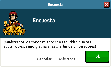 Los Embajadores es aquel grupo conformado por 9 personas dentro del Hotel Español que vela por nuestra seguridad y nuestra estadía dentro de las salas oficiales. De vez en cuando realizan charlas informativas para los usuarios con el fin de que estos aprendan un poco más acerca de la seguridad. Hoy ha sido habilitada una encuesta en su Central para que recibamos una placa si respondemos todas las preguntas correctamente. No te preocupes porque aquí te dejamos toda la información necesaria: