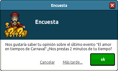 Hoy se lanza una encuesta destinada a la campaña de carnaval este sobre el último evento de El amor en tiempos de Carnaval. Esta encuesta de aloja en El Recibidor una vez ingresado a la sala te saldrá dicha encuesta lo cual es independiente, solo debes responder a algunas preguntas sobre el evento que ya hemos pasado.