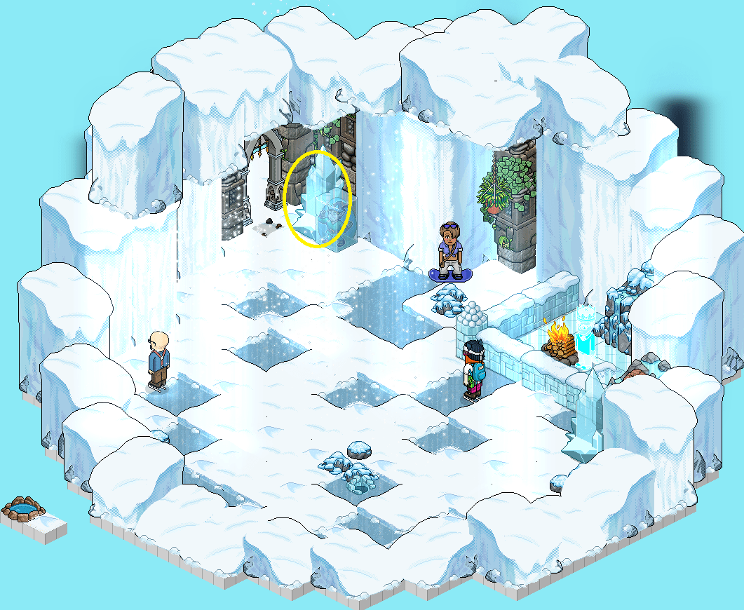 En esta siguiente sala tu misión será patinar hasta el trono de hielo sin ser tocado por la nieve. En tal caso, deberás esperar un poco hasta poder volver a intentarlo. Una vez hayas llegado al trono de hielo e ingreses por el teleport, recibirás la siguiente placa y una tortuga roja.