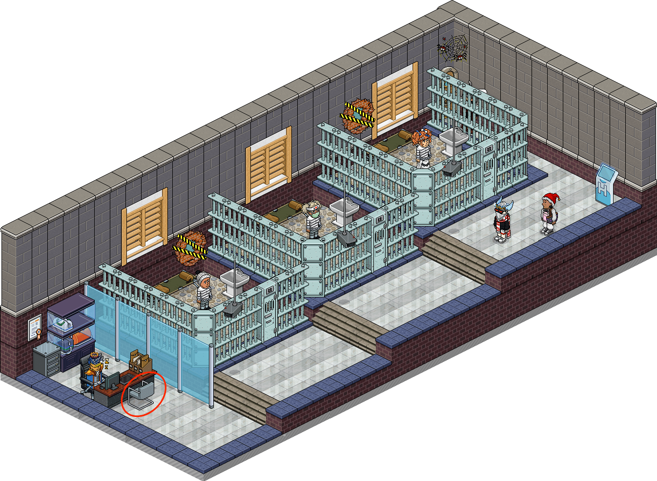 Una vez en la sala, deberás colocarte las 3 placas de los juegos anteriores del evento Habbluedo en tu perfil. Una vez las tengas puestas, baja por las escaleras y siéntate en la silla para recibir las recompensas: