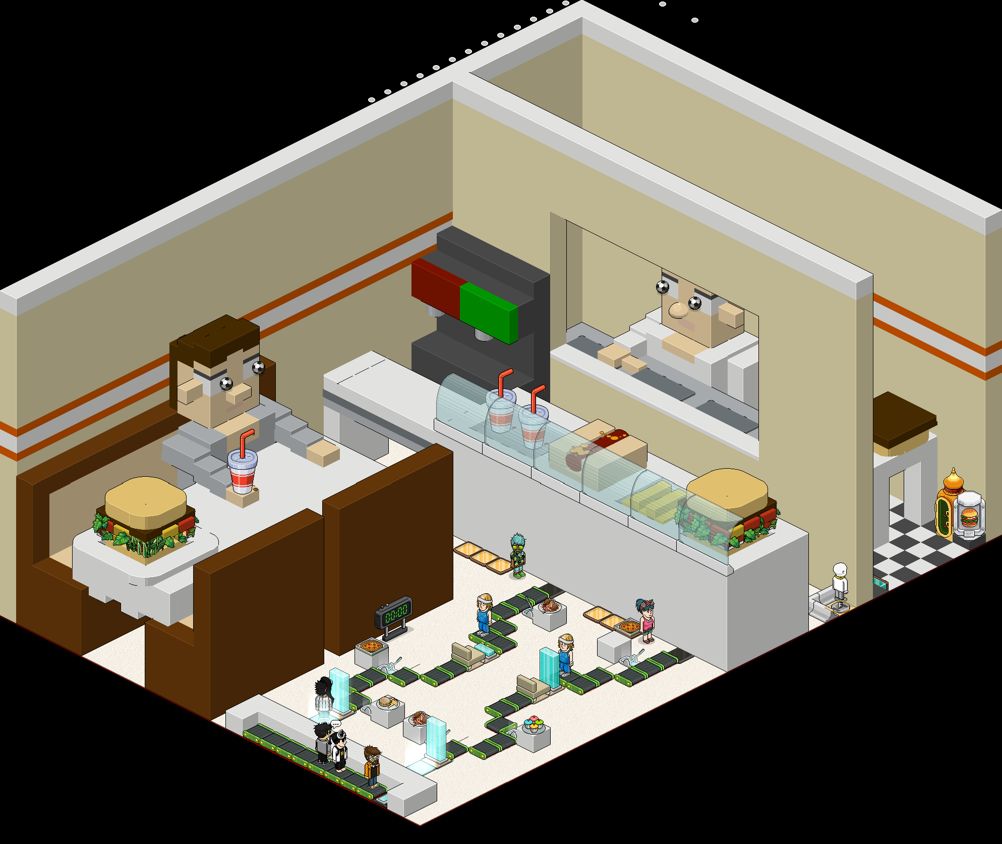 2.: Una vez hayas entrado, camina por los roller sin caerte hasta el otro extremo dando doble click sobre cada una de las palancas que haya por el recorrido para colocar la comida al bot.