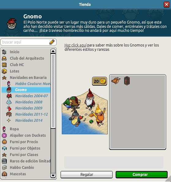 Así es. Habbo ha puesto a la venta hoy y hasta el 31 de diciembre los gnomos. Podrás hacerte con ellos por 20 créditos y recuerda que te puede tocar de un color diferente ¡hasta un gnomo dorado puede tocarte!