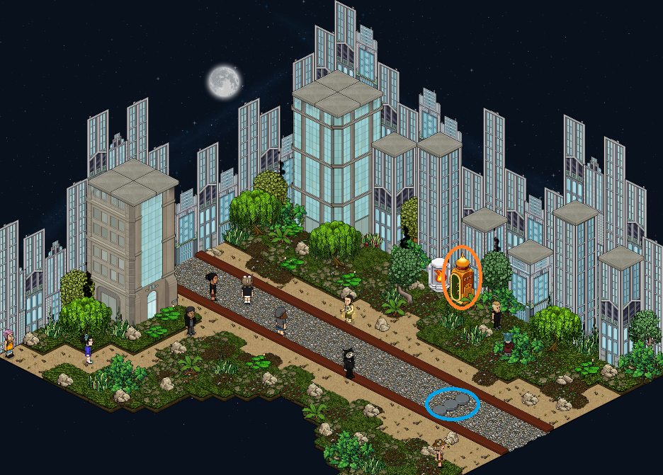 En primer lugar deberás entrar a esta sala Habborgente y una vez dentro deberás cruzar el camino que hay pisando los cilindros grises que se están moviendo por el camino, si pisas el suelo vuelves a empezar.