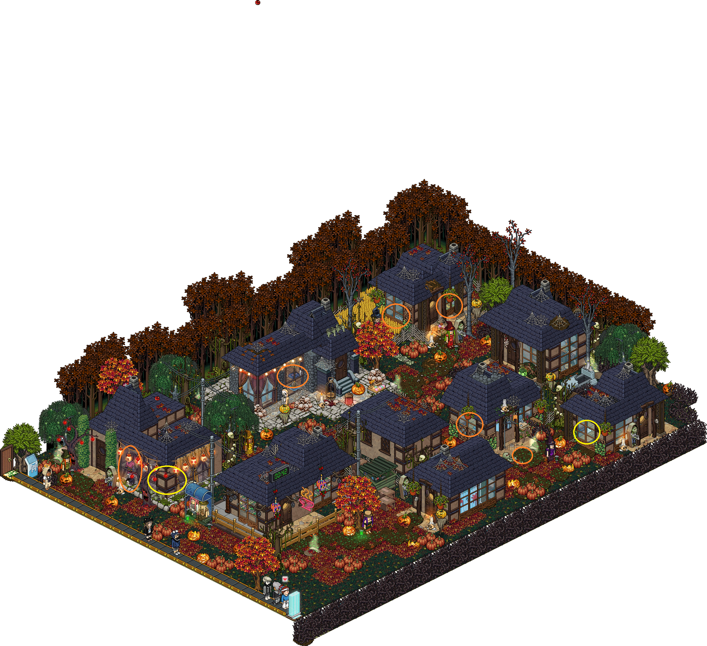Para comenzar a jugar, date un paseo por las tiendas y halla las nuevas prendas para las brujas, las cuales puedes recoger dirigiéndote a las zonas rodeadas de naranja en la imagen de más abajo. Cuando una bruja cambie de ropa, se encenderá una luz verde. Por último, pero no menos importante, mantén un ojo en el tiempo y, en caso de encontrar todas las prendas, estate atento a la palanca que aparecerá.