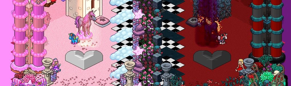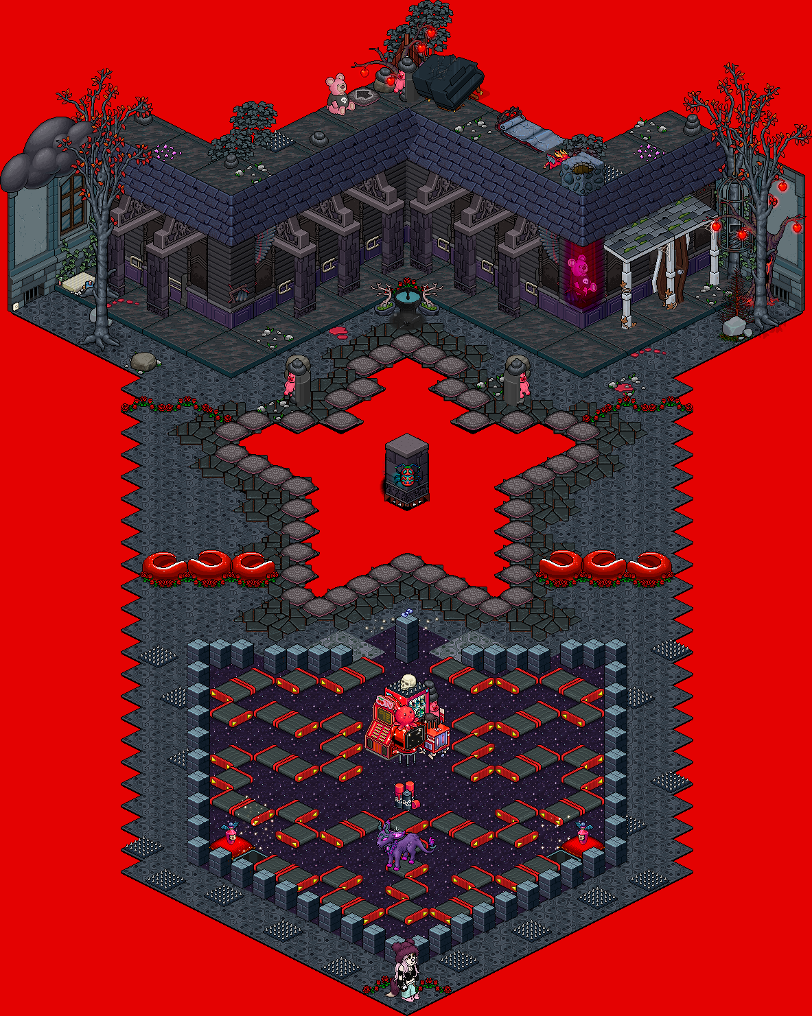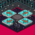 Para poder acceder los juegos primero deberás conseguir la placa que hay en esta sala. Para ello deberás estar atento a cuando aparezca el furni «Expositor de Placas», el cuál irá apareciendo en lugares aleatorios de la sala. Cuando la veas acércate a ella y la obtendrás automáticamente.