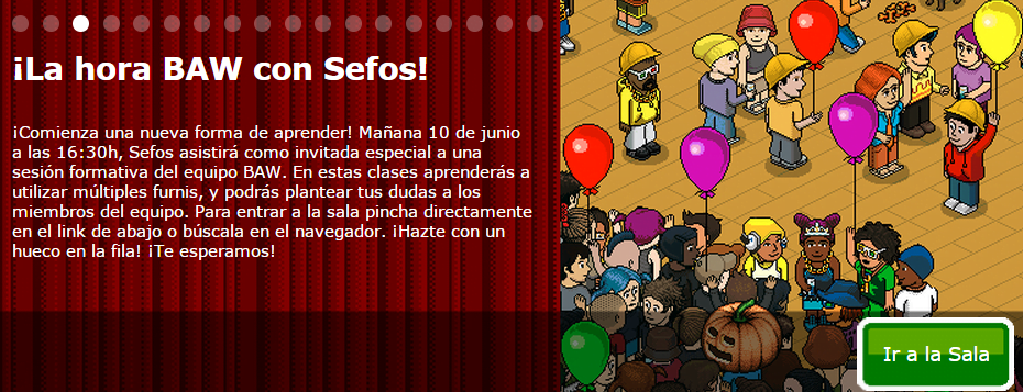 Muchos, seguramente, recordaréis las clases que dieron los miembros del Builders At Work de la pasada generación. En esas clases te enseñaban a apilar furnis, usar wired y muchas más cosas sobre la construcción. Hoy, ha salido en el topstories una noticia que nos informa de que mañana día 10 de junio a las 16:30 (Hora Peninsular) se hará una clase con los miembros del BAW y Sefos en esta sala.