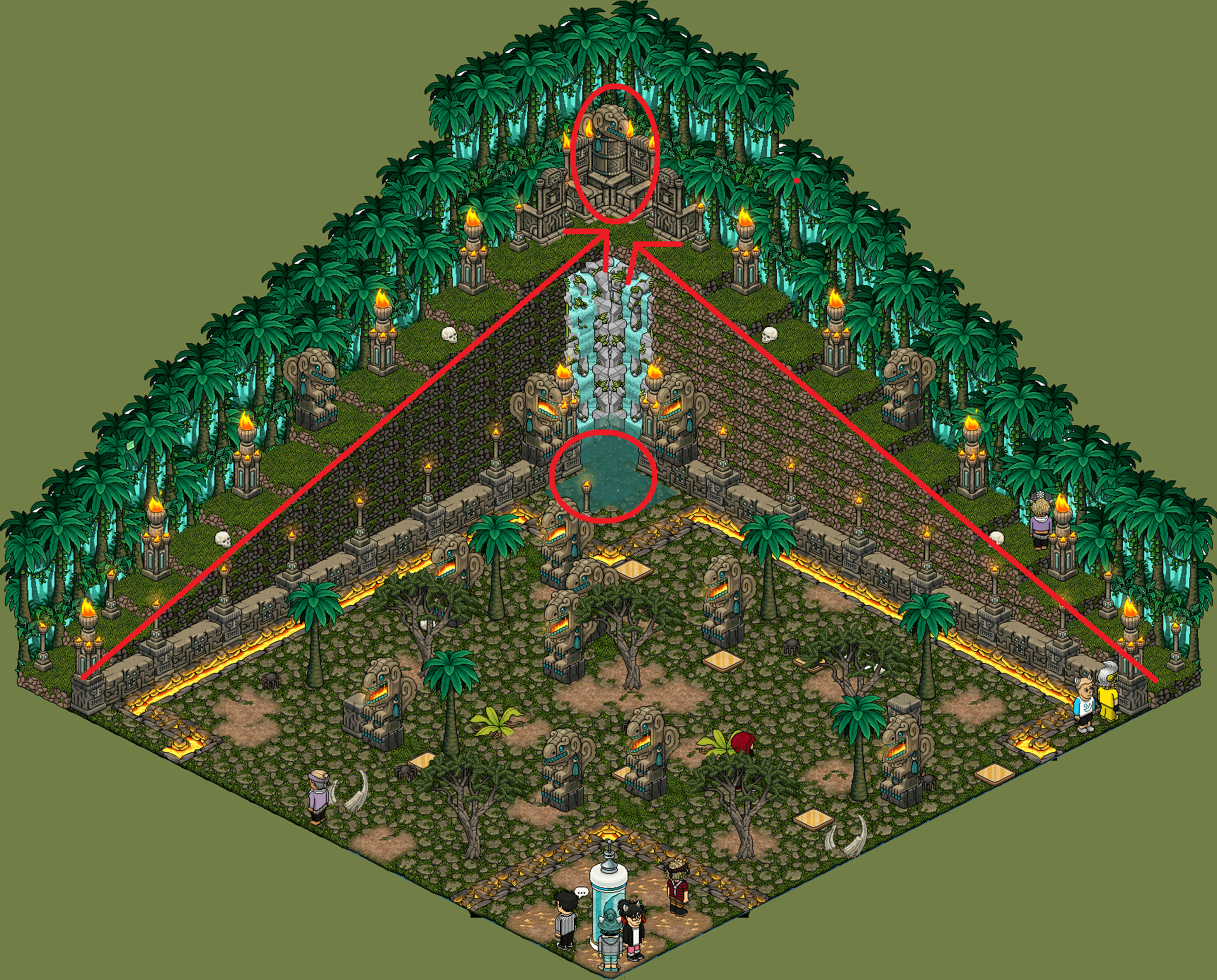 Tendremos que ir a la zona con agua sin pisar casillas y sin ser tocados por las estatuas que se mueven. Hecho esto tendremos que subir la montaña hasta llegar al teleport y continuar a la segunda sala.