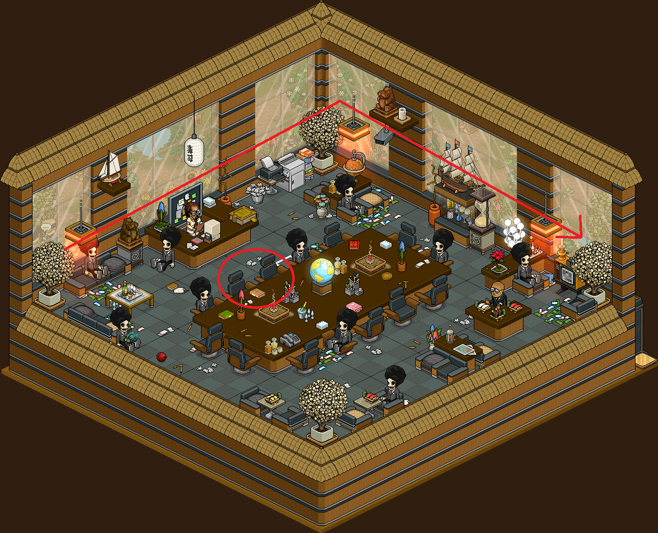 Sigue la dirección de la flecha roja hasta el otro lado. Una vez te encuentres dentro de la oficina coge asiento en los asientos hasta que des con el correccto y podrás continuar hacia la última sala.
