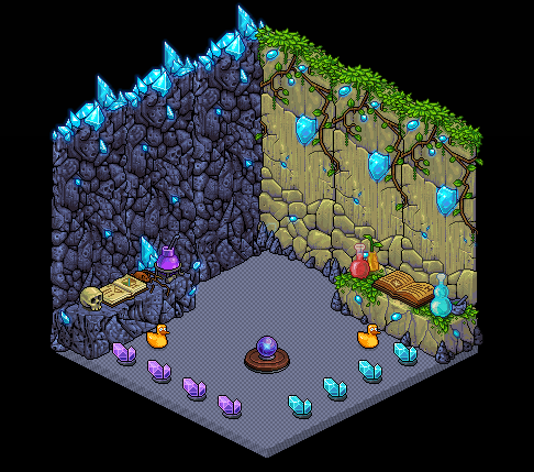 Nada más entres a Habbo, irás a una sala con algunos furnis alquilados de la categoría místico y en donde vemos un altar de alquimia (regalado por Habbo) en el centro para empezar a craftear.