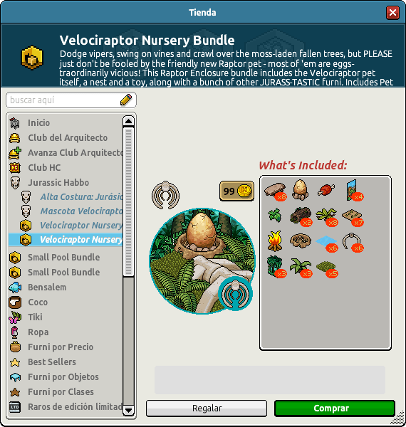 En este día ha aterrizado un nuevo lote llamado «Lote Recinto Velociraptor» que además trae 57 furnis jurásicos en total. Este lote lo puedes adquirir en la Habbo Tienda por dos métodos, por 39 créditos y 39 diamantes o 99 créditos, ¡hazte con el que más se acomode a tu monedero! y no es solo eso, también por la compra de este lote obtendrás una exclusiva placa y una exclusiva mascota Velociraptor. ¡Mira, mira!