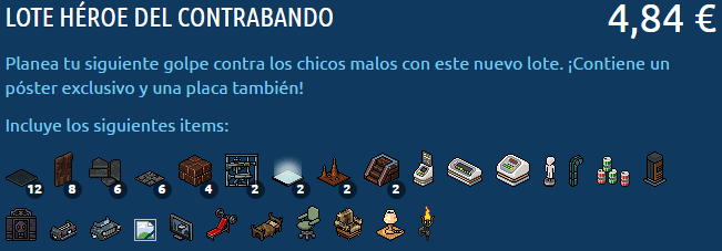 El lote contiene un furni exclusivo por su compra y lo podrás conseguir de tres formas diferentes mediante 99 créditos, por 45 créditos y 45 diamantes o de forma directa ahorrándote la mitad. También conseguirás una hermosa placa por su compra.