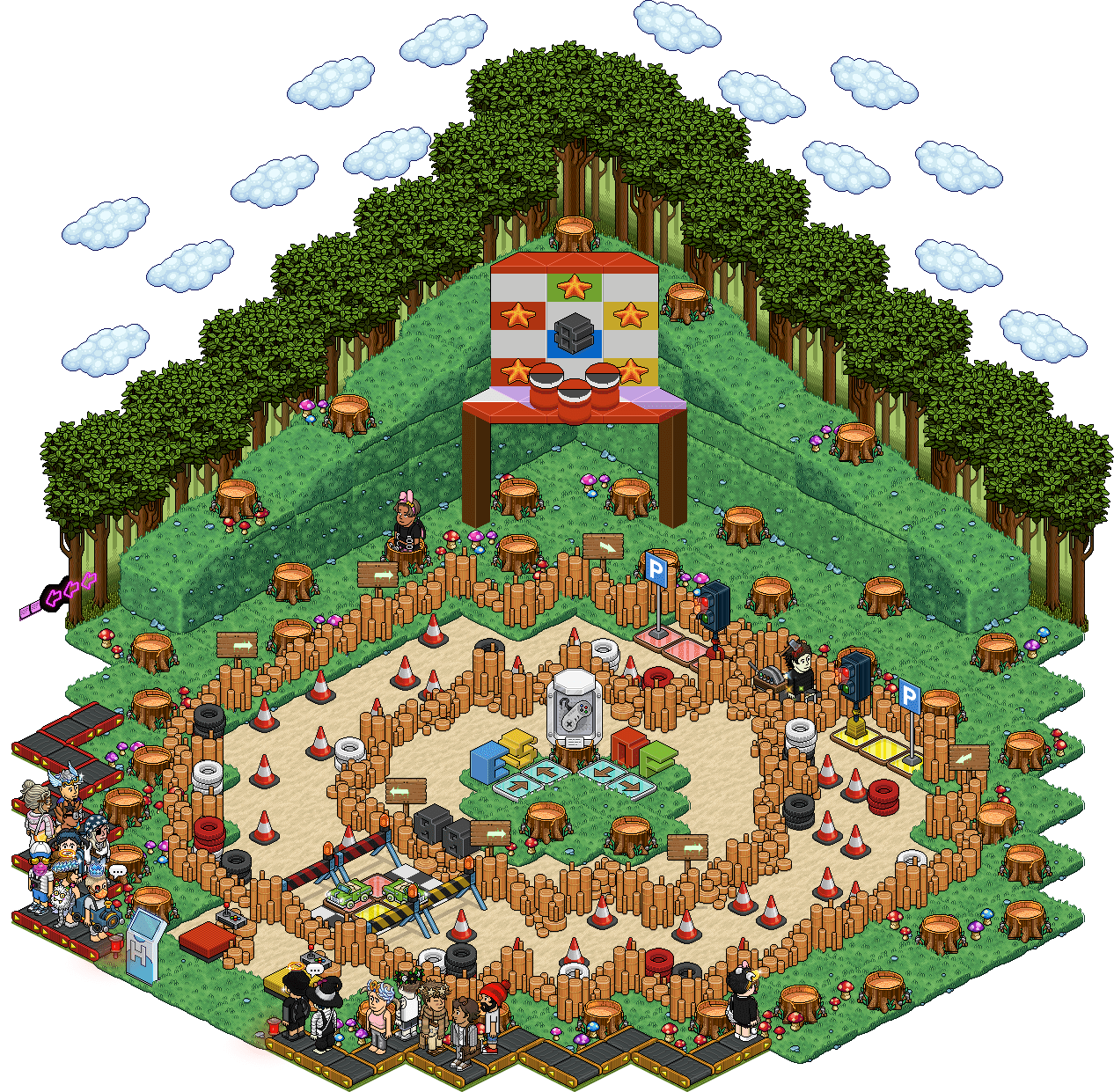 Cuando inicie el evento (fondo de sala amarillo), deberán estar fuera de las puertas de cristal, porque cuando inicie los que estén dentro no podrán jugar. Aquí deberán jalar una de las dos palancas que aparecen para comenzar, los llevará a la primera casilla, entonces deberán llegar a una de las dos estrellas que aparecerán en el campo de juego, ¿Cómo? Diciendo: “*”