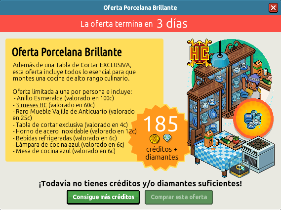 Podremos adquirir esta oferta por 185 créditos y 185 diamantes e incluye: un anillo esmeralda, 3 meses de HC, un raro mueble vajilla de Anticuario, una tabla de cortar exclusiva, un horno de acero, bebidas refrigerantes, una lámpara de cocina azul y una mesa de cocina azul.