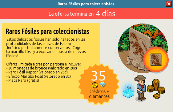Esta oferta llamada “Raros Fósiles para coleccionistas” viene cargada de mucha historia y diversión. Esta oferta viene con un Raro Fósil Raptor, un efecto Martillo Fósil, 20 monedas de bronce y nada más y nada menos que una placa Raro por la compra de esta oferta. Dicha oferta tiene un precio de 35 créditos y 35 diamantes y además solo estará por 4 días.