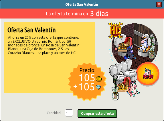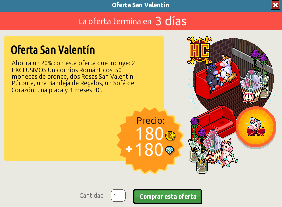 La campaña San Valentín lleva con nosotros ya mucho tiempo y esta no para de sorprendernos como el primer día. Hoy Habbo ha puesto en venta dos nuevas ofetas, las cuales estarán disponibles durante 3 días. ¿Quieres ver qué contienen estas ofertas? ¡Pues sigue leyendo!