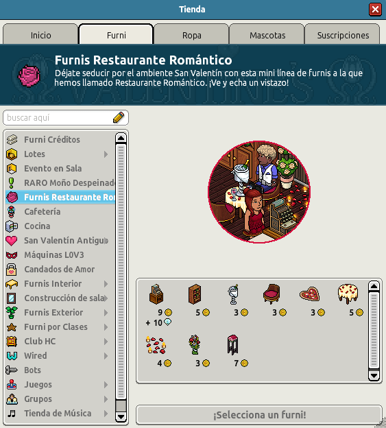 La campaña San Valentín ha entrado de lleno cargada de novedades que no paran de llegar. En el día de hoy se han producido unos cambios en el catálogo, ya que se han añadido tres nuevas categorías. Así es, si eres un fanático de los furnis estás de suerte ya que se han añadido las categorías: Furnis Restaurante Romántico, Cocina y Cafetería. Sin nada más que decir, os dejamos con las imágenes de los furnis.
