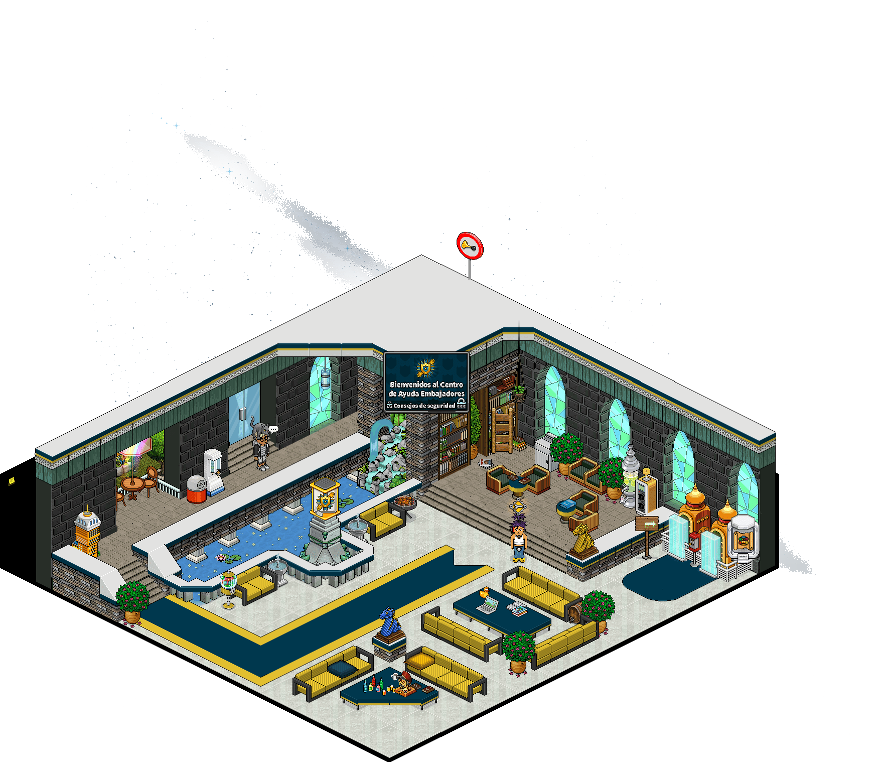 Lo primero que tendrás que hacer será acceder a la sala llamada Centro de Ayuda Embajadores de masteracco67, y, una vez en ella, decir «:port» y entrar por el teleport imperial: