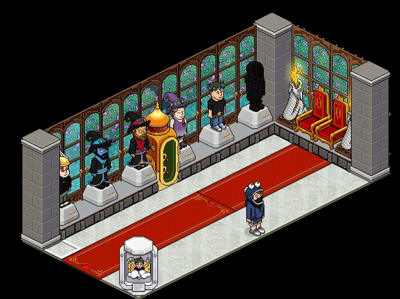 Cuando estés en la siguiente sala, tendrás que accionar cualquiera de las palancas y, posteriormente, pasar por el teleport imperial. En la última sala, tendrás que sentarte en los tronitos.