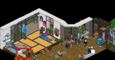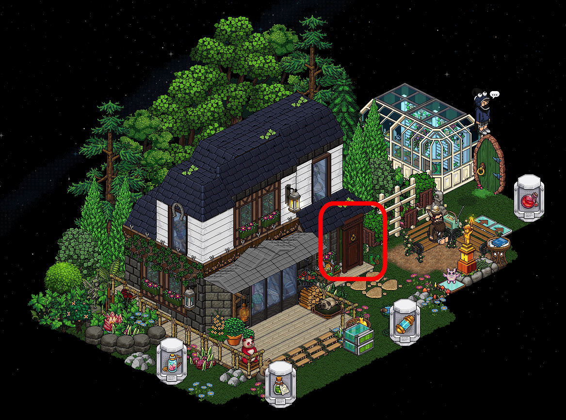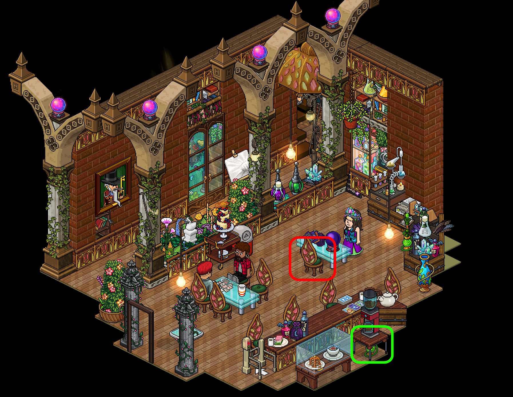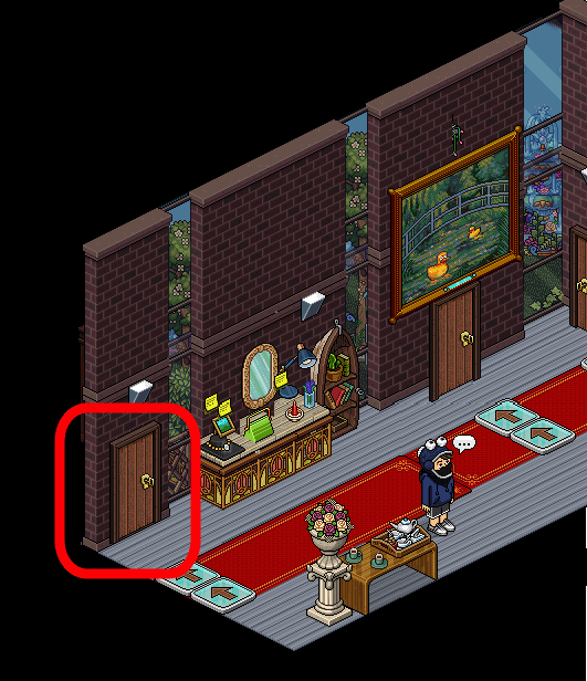 Tras ello, llegarás a la última sala de la primera parte del evento. En ella, tendrás que sentarte en la silla marcada de rojo en la imagen para, dependiendo del azar, ser devuelto al inicio o pasar a la zona cerrada. Si tienes suerte y llegas a dicha zona, tendrás que utilizar la pipa de pompas marcada de verde. La cuarta placa será tuya.