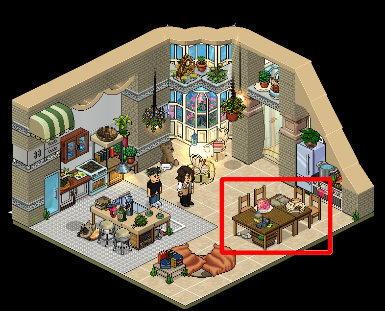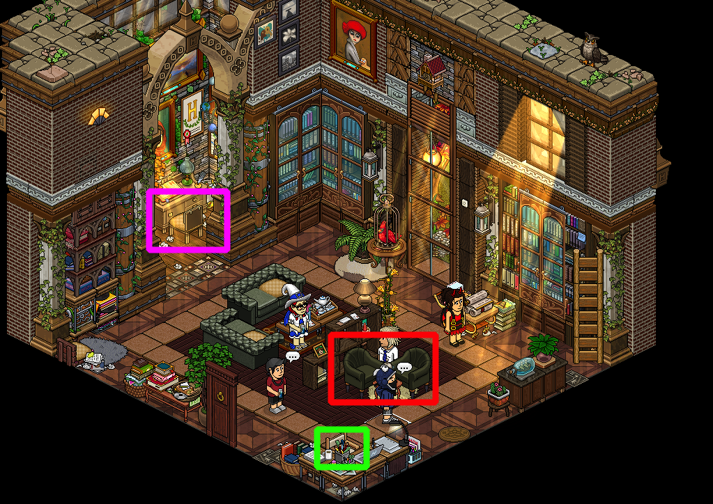 Cuando te encuentres en el estudio, lo primero que tendrás que hacer será sentarte en las sillas que te marcamos de rojo en la imagen de más abajo. Tras ello, siéntate en la silla marcada de verde y di *escribir poema de amor* para, posteriormente, dirigirte hasta la silla marcada de morado. La segunda placa del evento será tuya.