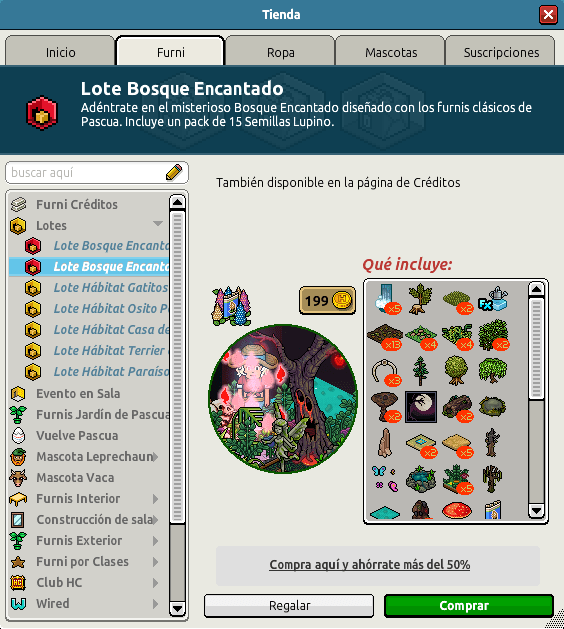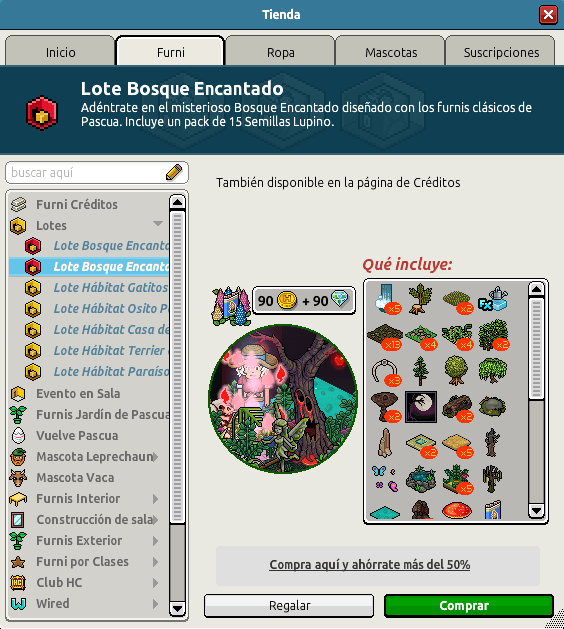 Se conoce como “Lote Bosque Encantado«, y te recomendamos adentrarte en este misterioso Bosque Encantado diseñado con los furnis clásicos de Pascua. Además, incluye un pack de 15 Semillas Lupino.