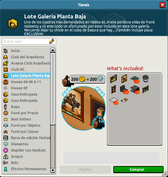 Hoy lunes, Habbo ha querido sacar un nuevo lote llamado «Lote Galería Planta Baja» en donde se ven cuatro cuadros que cuestan 500 diamantes cada uno en el catálogo. Podrás adquirirlo en el catálogo por tiempo limitado y tiene un precio de 200 créditos y 200 diamantes.