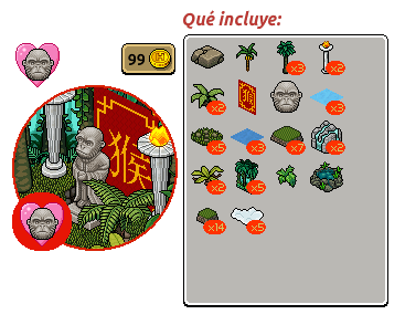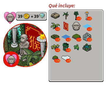 Dejando atrás las explicaciones, a continuación podrás ver el nuevo Lote de Sala disponible en el catálogo a un precio de 39 créditos + 39 diamantes o 99 créditos con opción a regalar. Viene acompañado de 2 furnis nuevos y una mascota mono, además como es común también trae consigo una exclusiva placa por su compra.