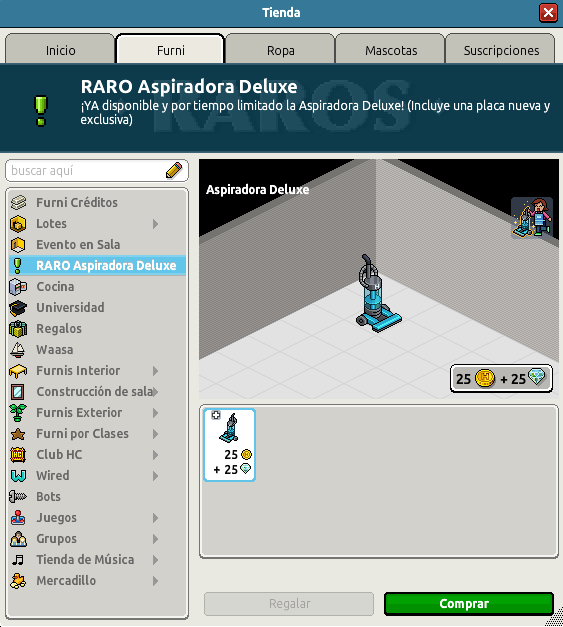 Este raro se llama Aspiradora Deluxe. Con esta aspiradora serás un maestro de la limpieza ¿te lo vas a perder? Lo podrás adquirir por el precio de 25