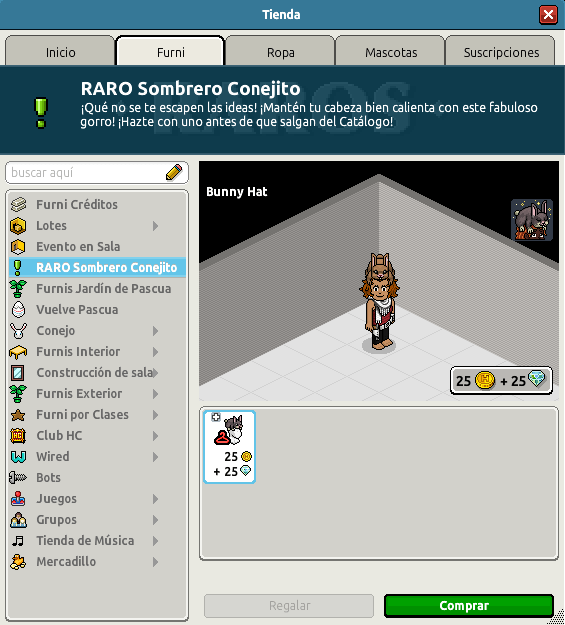 Este raro se llama Sombrero Conejito, y para que no se te escapen tus ideas… mantén tu cabeza bien calienta con este fabuloso gorro. Lo podrás adquirir por el precio de 25
