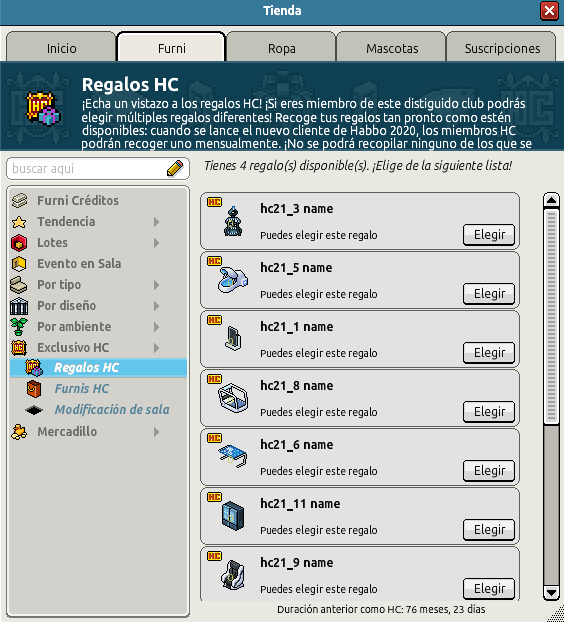 Un día más estamos aquí, y Habbo para que no nos aburramos saca en venta los nuevos lotes, placas, juegos, etc… a la luz. Pero hoy le ha tocado el momento a los miembros del Club HC, ya que han puesto en catálogo los nuevos regalos HC que ya te informábamos de ellos en noticias anteriores. ¡Conoce todos los regalos!