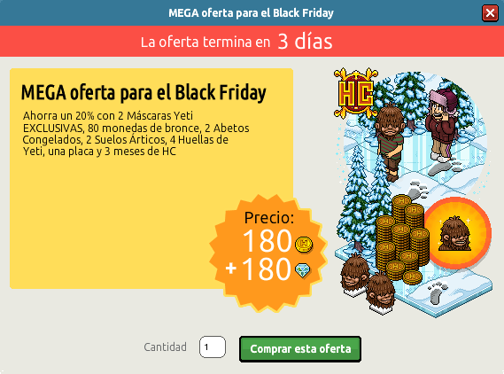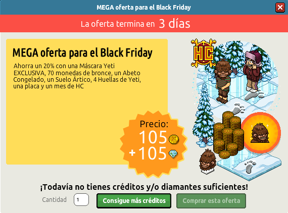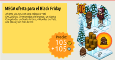 La tradición del Black Friday (viernes negro) va cobrando cada año más fuerza en diferentes puntos de la geografía mundial. Prueba de ello son las numerosas tiendas que colocan su cartel de rebajas por el Black Friday. Habbo no ha querido ser menos y también ha colocado una oferta muy especial para todos los usuarios. ¡A continuación os las mostramos!