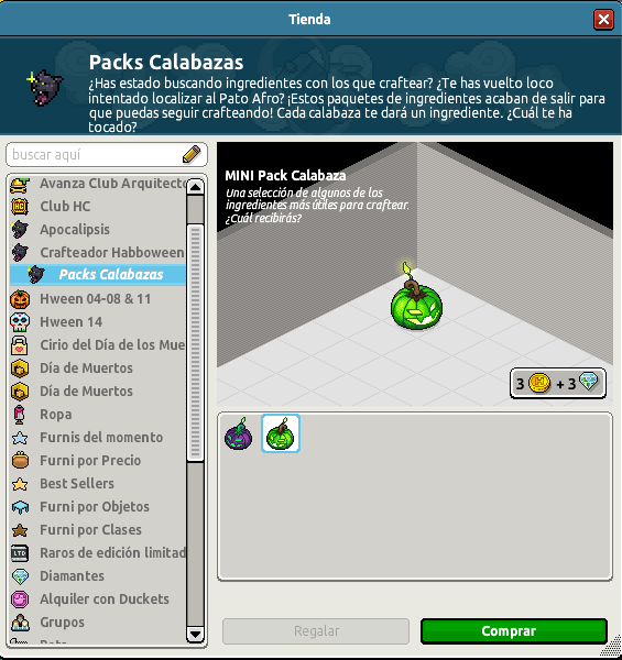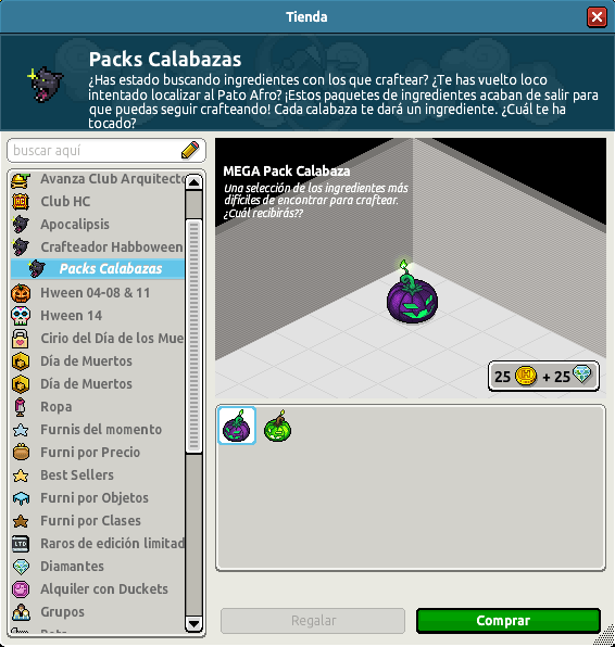 Los Packs de Calabaza no son sino calabazas que contienen un furni necesario para llevar a cabo un crafteo. Existen dos tipos de calabaza: la calabaza verde y la calabaza morada; las cuales se diferencian por los furnis que contienen.