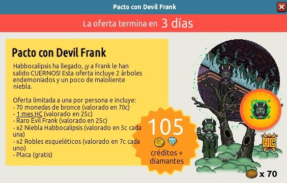 En Habbo ES hemos encontrado una nueva oferta que estará disponible durante 3 días. Esta oferta se llama como dice el título Pacto con Devil Frank y en su interior tiene 70 monedas de bronce, un mes de HC, el Raro Devil Frank, 2 árboles esqueléticos y dos suelos Niebla apocalipsis; esta oferta esta limitada a una persona.