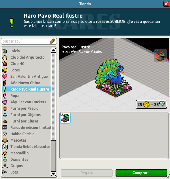 Como podéis apreciar en la imagen anterior el precio de este raro es de 25 créditos y 25 diamantes. Además, su compra incluye una placa exclusiva que corrobora que, efectivamente, te has hecho con un pavo real.