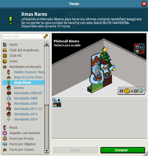 Los rares no dejan de acompañarnos en todos los eventos que se realizan en Habbo. Por este evento Navideño, ya son tres los rares no LTD que han salido al catálogo para que podamos hacernos con ellos (recordemos la Torre del Reloj y el Trineo de Invierno). Pues en esta ocasión ha salido al catálogo el rare: Photocall Bávaro.