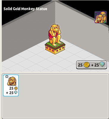 Este raro se llama Estatua Mono Dorado y tiene tres posturas distintas, parecidas a los famosos emoticonos de mono. El raro tiene un color amarillo y está sentado sobre un cojín verde y tendrá el precio de 25