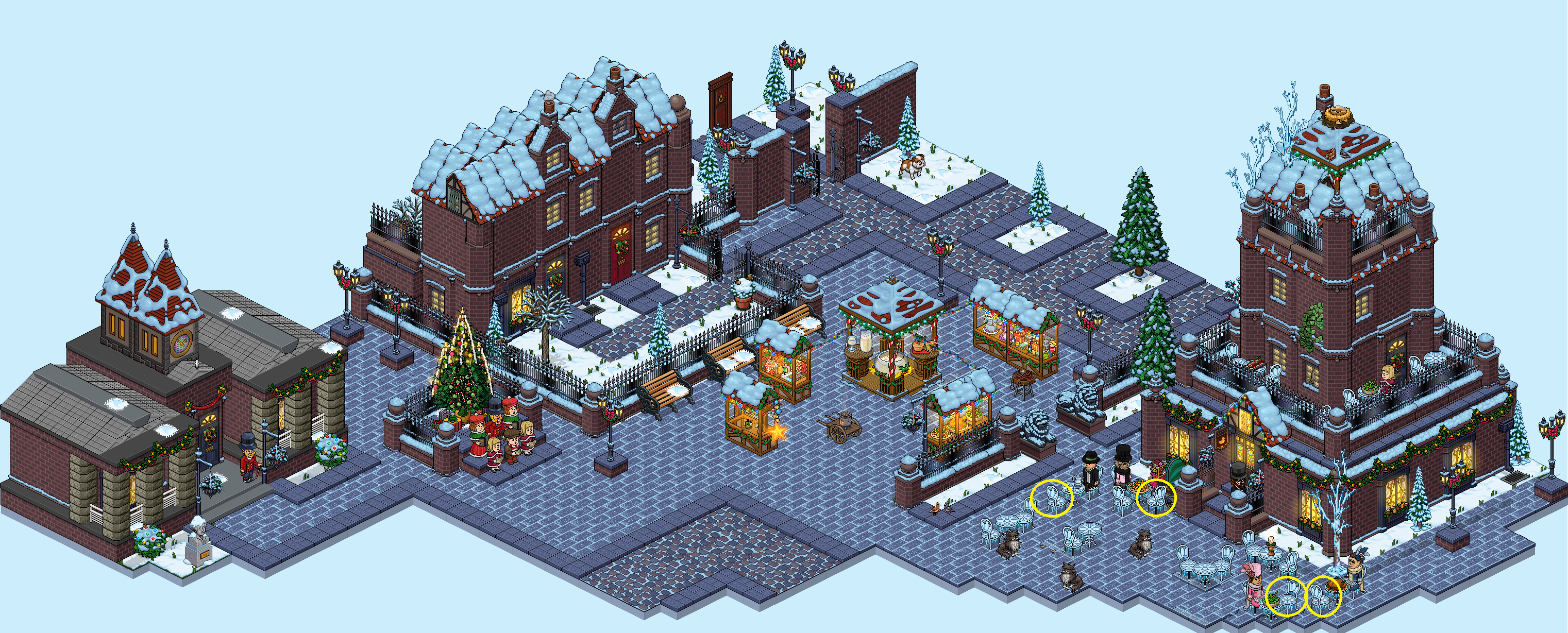 En la ciudad, el manager ha de evaluar a todos los residentes, incluidos los gatos. Pregunta a los Habbos del pub lo siguiente: ¿Tienes alguna sobra? Cuando hayas podido alimentarles a todos, usa la palanca para recibir una placa y uno de los tres objetos aleatoriamente: