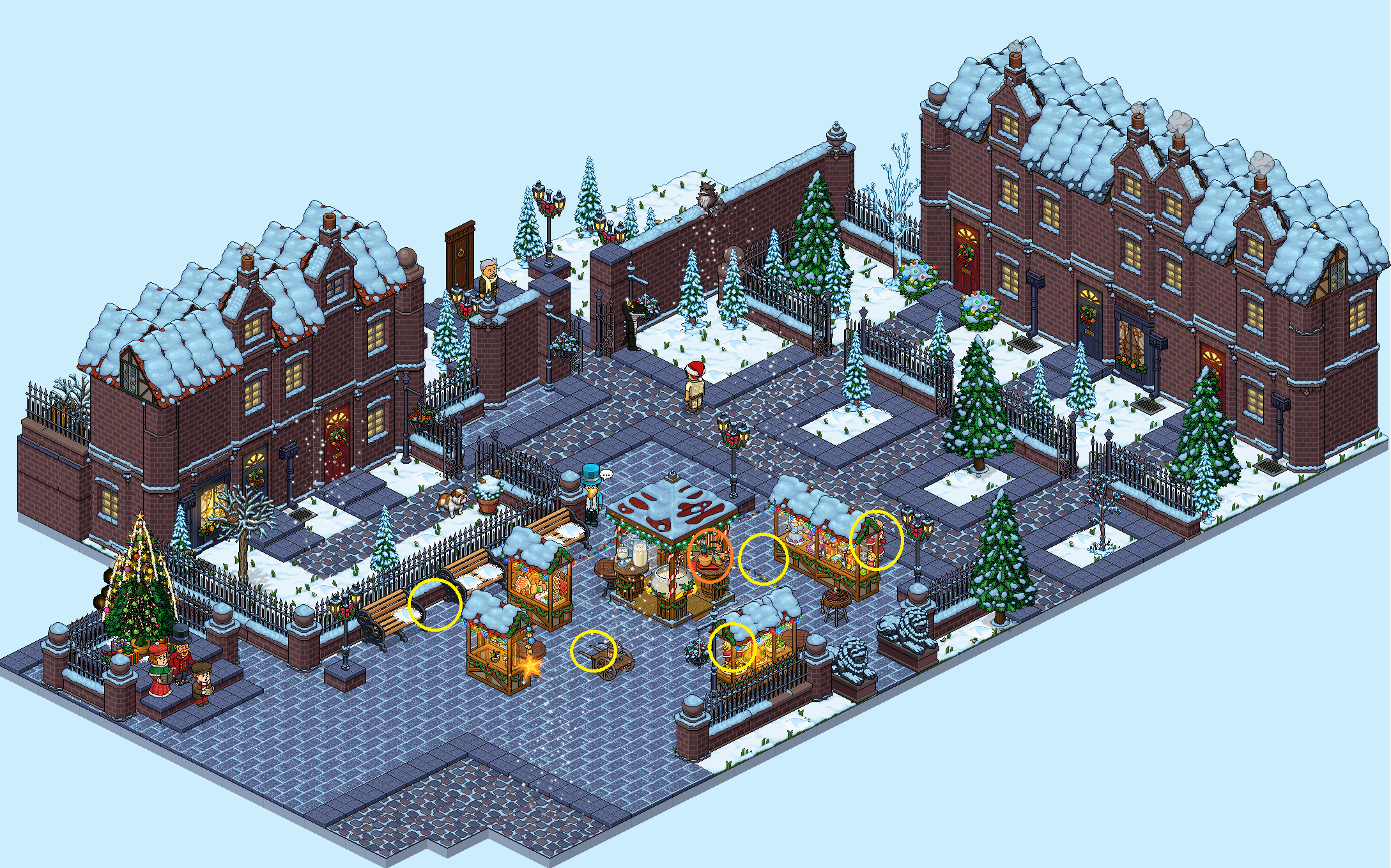 No hay Navidades sin un buen coro. Recluta a cantantes de villancico para formar el mejor coro que se haya visto nunca en Habbo. Para ello tendrás que hacerles la siguiente pregunta: «¿Quieres unirte al coro?» En el muñeco señalado en naranja deberás decir: «do you want to join the choice?» Cuando tengas a los seis integrantes, usa una de las tres palancas para recibir la siguiente placa y uno de los tres objetos aleatoriamente: