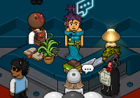 Combinación 1 (bots de la derecha): colócate delante de los furnis Habbo Monroe, Jarrón Bazar y Estatua Héroe y escribe ‘Examinar‘ delante de cada uno de ellos.