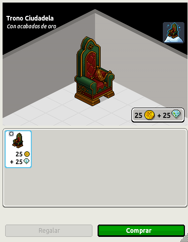 Siguiendo la previsión que Habbo nos dio a finales del mes de noviembre sobre la Navidad, hoy día 20 de diciembre ha salido a la venta el último raro normal (quedando pendiente aún el rare LTD para el 22 de diciembre). El rare podremos comprarlo al mismo precio que los tres anteriores (tiara, búho y Rufus). En efecto, se trata del raro Trono Ciudadela cuyo aspecto es el siguiente: