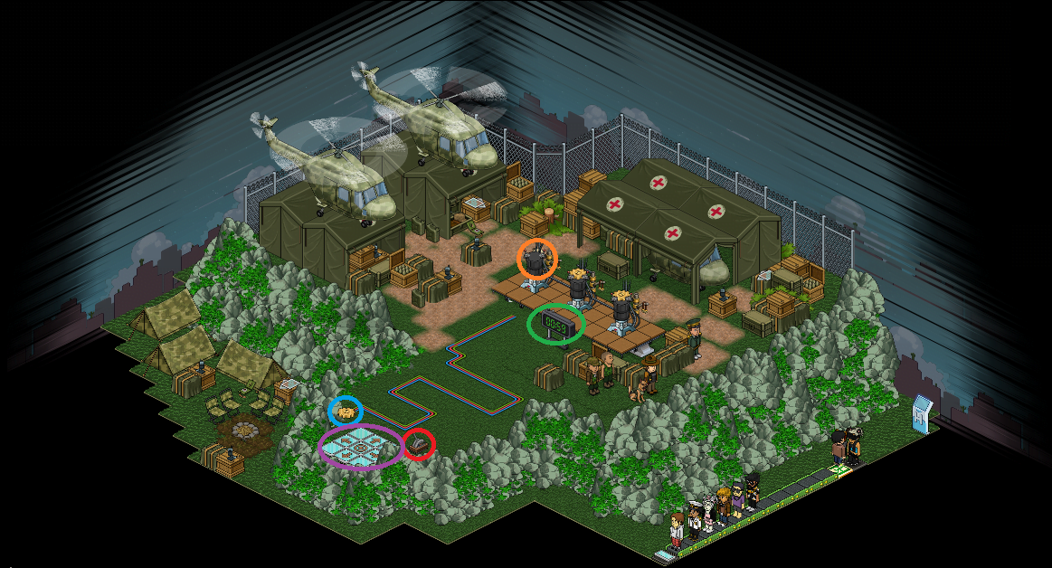 Antes que nada, deberás dirigirte a la sala Fuerzas Armadas: Rango Ingeniero 1 localizada en la sección Juegos del Hotel dentro de la categoría de salas públicas. Dando click aquí también podrás acceder a la sala directamente.