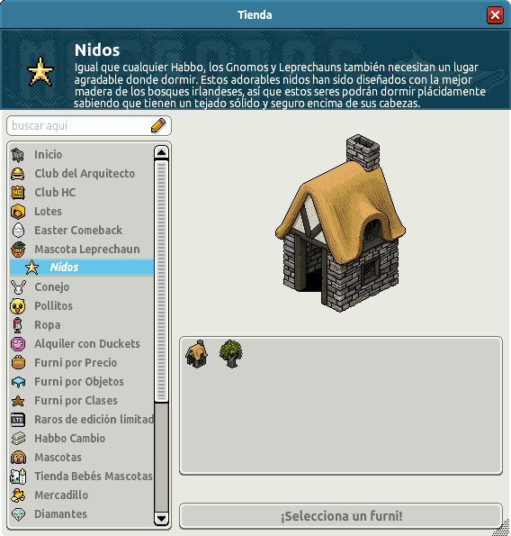 La mascota la podrás encontrar en el catálogo en la categoría Mascota Leprechaun de la tienda esta tiene un costo de 50 créditos y ademas trae una placa exclusiva. También podrás encontrar en la subcategoría Nidos, furnis para que tu Laprechun duerma cómodamente. Tienes oportunidad hasta el 20 de marzo.